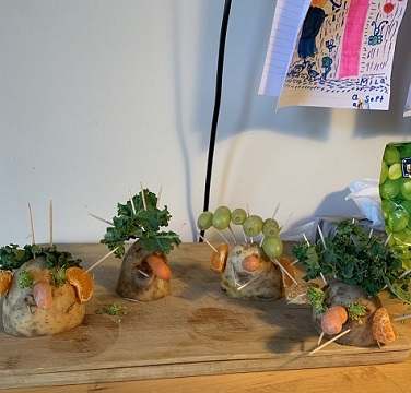 W ramach tematu „Jesień w sadzie i ogrodzie” klasa II wykonała fantazyjne ludziki z warzyw i owoców. Za podstawę posłużyły nam ziemniaki, chociaż Bernard stworzył również marchewkową pannę, cebulowego psa i całą gromadkę tajemniczych figurek z cukinii. Zosia zrobiła swoją wielką damę z batata – słodkiego ziemniaka – i nazwała ją Pani Kartofelska. Antoś nadał swoim trzem ludzikom imiona: Bob, Ben i Ratatouille (znakomity kucharz z rzodkiewki na selerowych nogach!) Do kartoflowej rodzinki Weronika włączyła również kartoflowe zwierzątka, a ludziki Mili wyglądają jakby wyszły prosto od kartoflowego fryzjera. Na naszej wystawie znajduje się jeszcze trzyosobowa familia o jagodowych oczach i ustach z buraka, która pragnie zachować anonimowość.