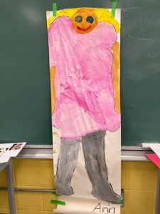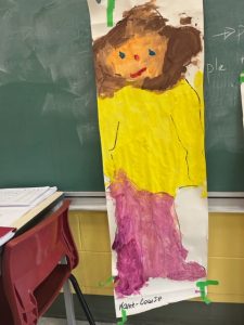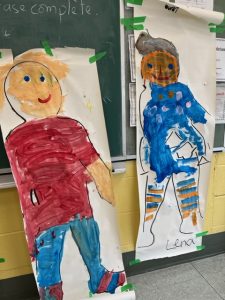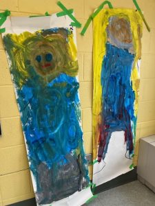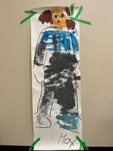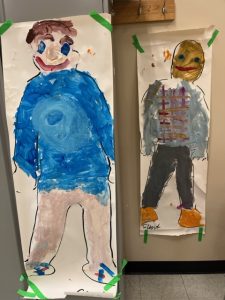 Na zajęciach 22.04 dzieci z grupy przedszkolnej i zerówki malowały swoje autoportrety. Najpierw odrysowaliśmy kontury sylwetek naszych artystów na podłodze, a następnie przenieśliśmy płachty papieru z wykonanymi szablonami na stoły, aby sami już mogli kontynuować swoje dzieła. Kreując swoje wizerunki artystyczne dzieci przyjrzały się uważnie swoim ubraniom, aby odpowiednio dobrać kolory. Na końcu namalowały swoje włosy, niekiedy świadomie je wydłużając. Efekt finalny można było podziwiać pod koniec lekcji, kiedy dzieci pozowały do zdjęć przy swoich obrazach.